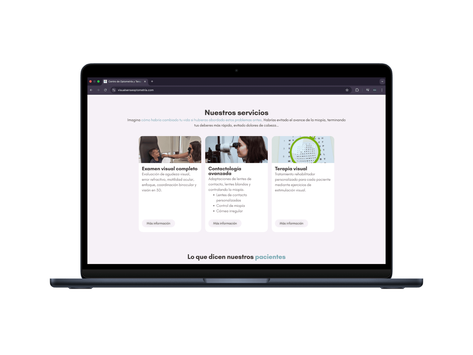 En este proyecto para Visual Sense, nos encargamos de dar vida a su nueva página web. El diseño inicial se desarrolló en Figma. Una vez aprobado, se implementó en WordPress, asegurándonos de que fuera completamente adaptable y optimizada para todos los dispositivos. Además, realizamos una sesión fotográfica en el local de Visual Sense para capturar el espacio y sus servicios. Estas fotografías fueron editadas cuidadosamente en Lightroom.